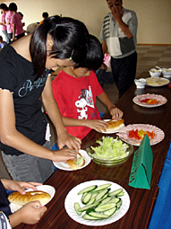 朝食は自分達で健康を考え食材をパンにトッピングします。