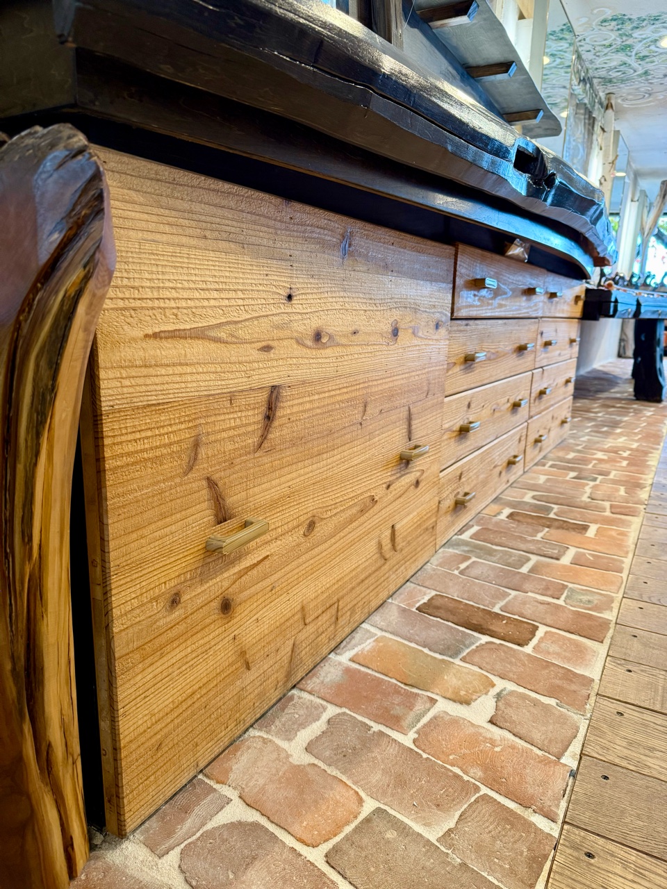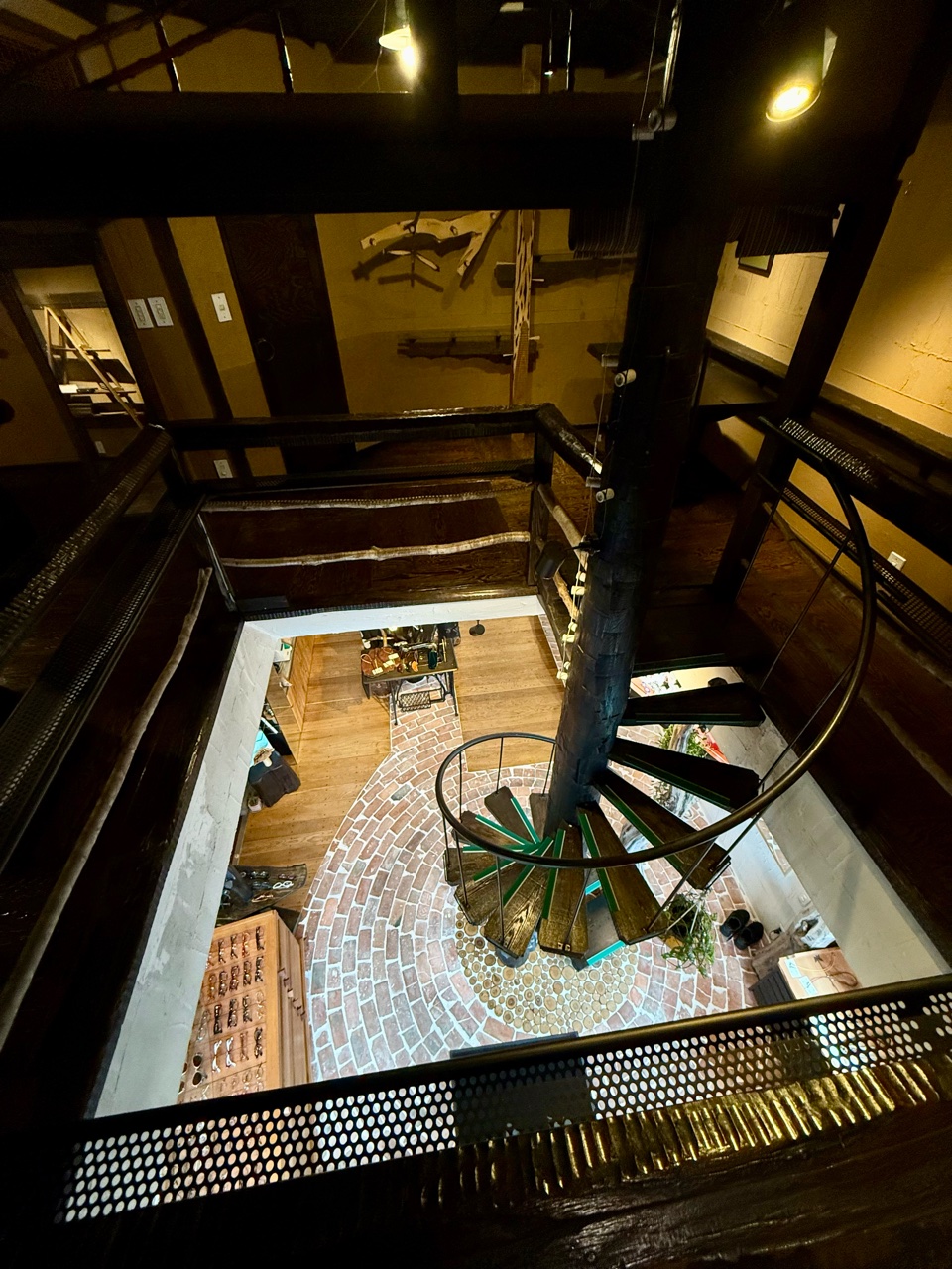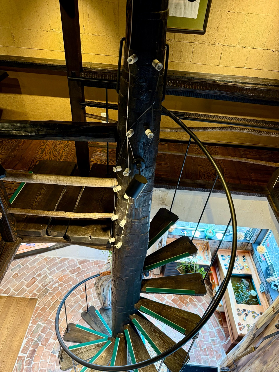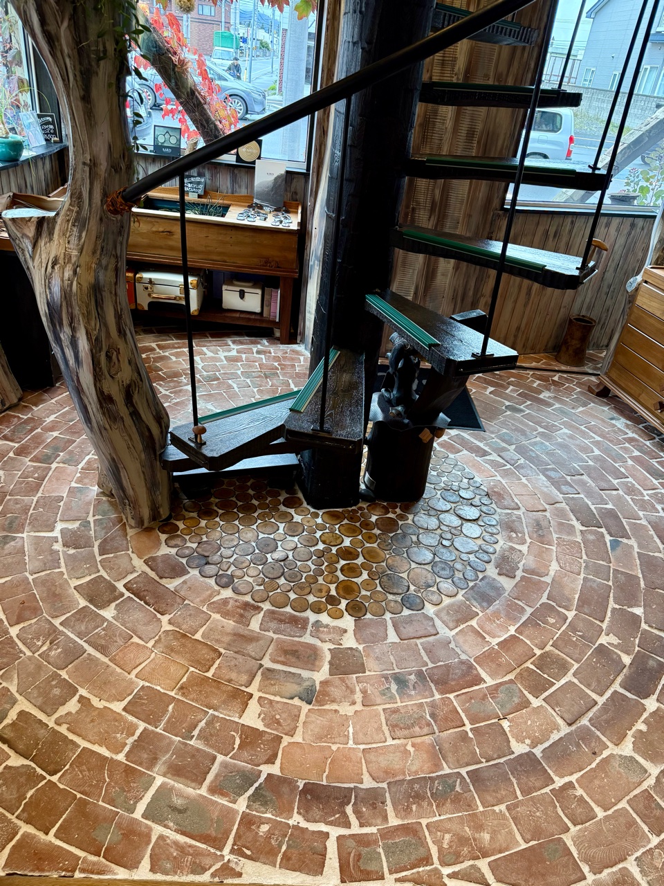 螺旋階段の周りはドングリの木を輪切りにして埋め、その周りを古レンガでサークルを作っています。