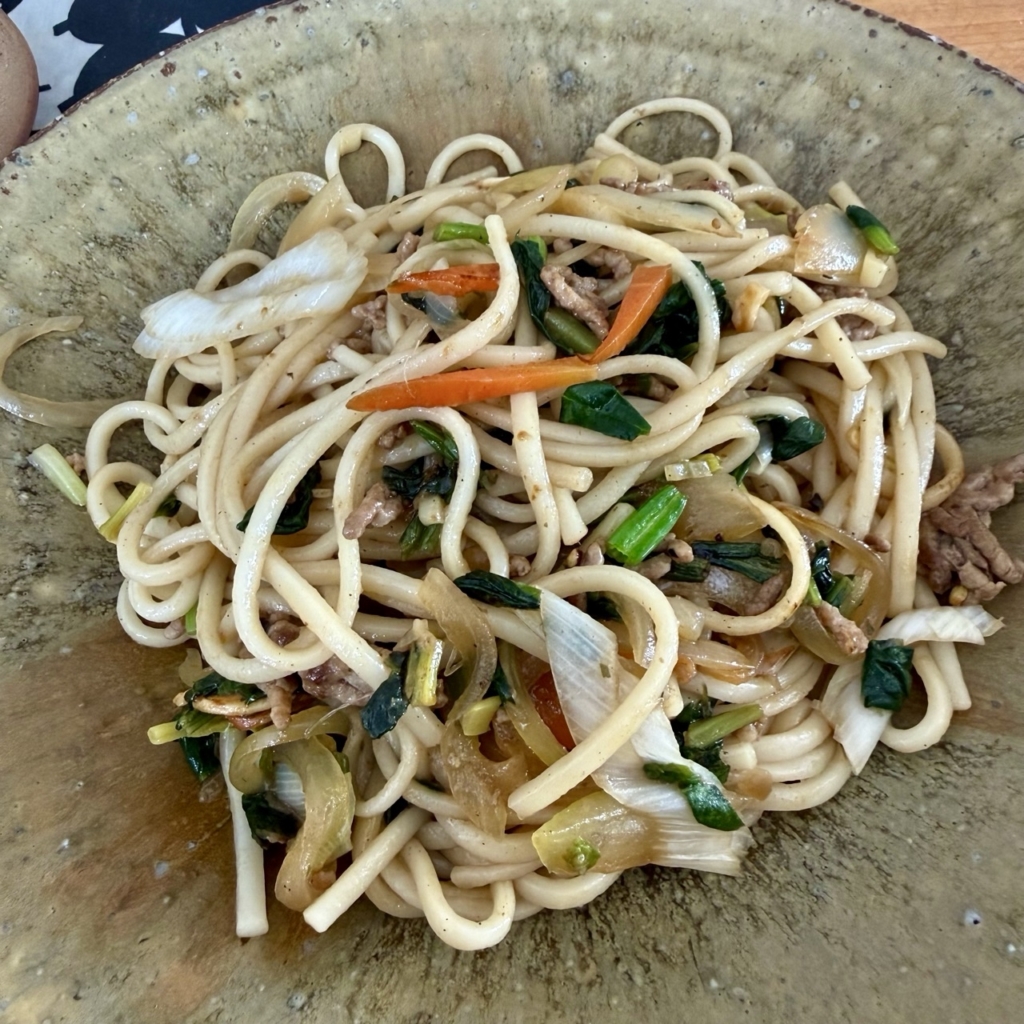 ウースターソース、富良野ソース、もう一種のソースとにんにくで作った。牛肉豚の合挽、玉ねぎ、ネギ、人参、ほうれん草を炒めて、自作のタレを絡めて完成。