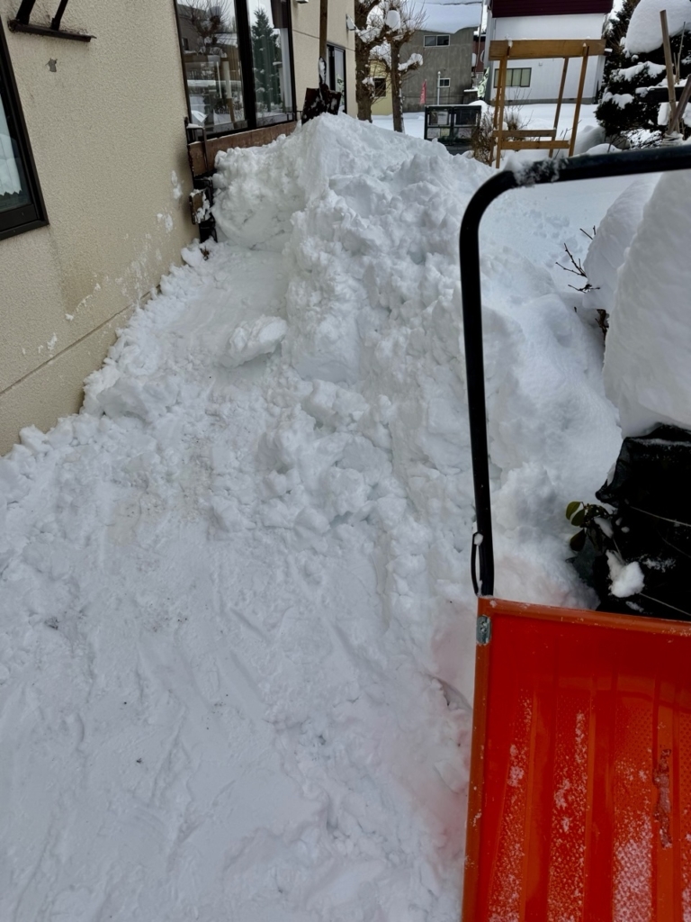 この雪、高さ1メートルほど掘りおこし隣り空き地に運ばなければいけない。メチャ固い〜剣先スコップが入っていかない。足で体重を思い切り乗せて砕きながらスノーダンプで運ぶ。
