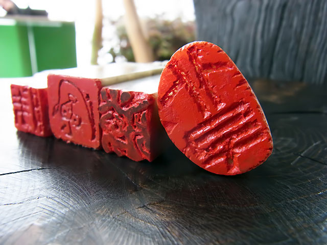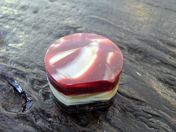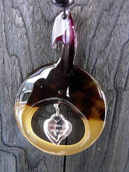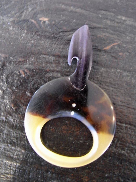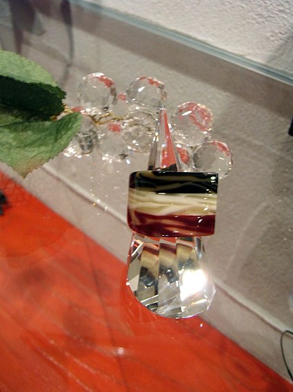 端材のアセテート生地を張り合わせて作ったメガネホルダーと指輪。