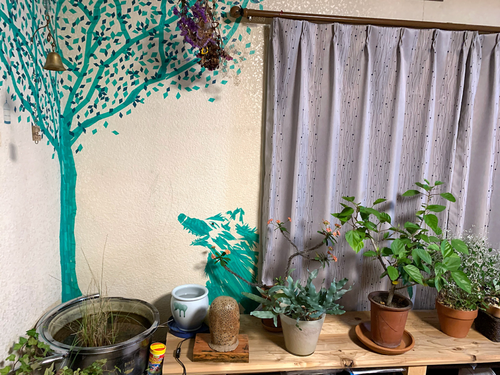 ボンドに壁紙をかじられたところをマスキングテープで木を表現、2色のマスキングテープで葉っぱを作った。