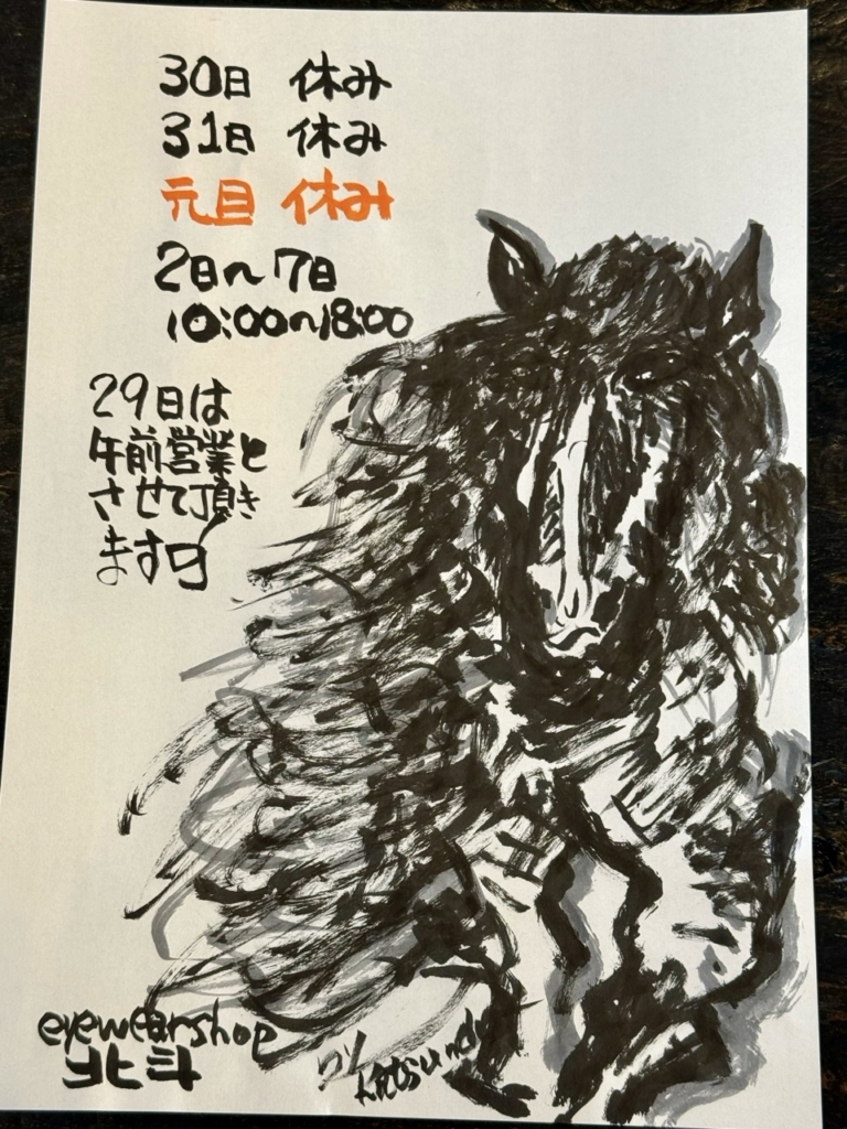 2025年eyewearshop北斗の営業を終了します! 2025年12月29日 (Mon) PM1:24- 日常 めがねと鯖江と人生 似顔絵 絵/写真/趣味 絵手紙 2025年いい年になりました。午後から休ませていただきます。 来年も宜しくお願いいたします。良い年をお迎え下さい! では又〜katsundo この記事を書いた人 katsundo - 書いた記事一覧 前の記事 : 年末年始用の魚介類を購入した コメント お気軽にコメントよろしくね コメントを投稿する コメントをキャンセルメールアドレスが公開されることはありません。 Name(必須です) Email(必須です) Web Site Comment Δ