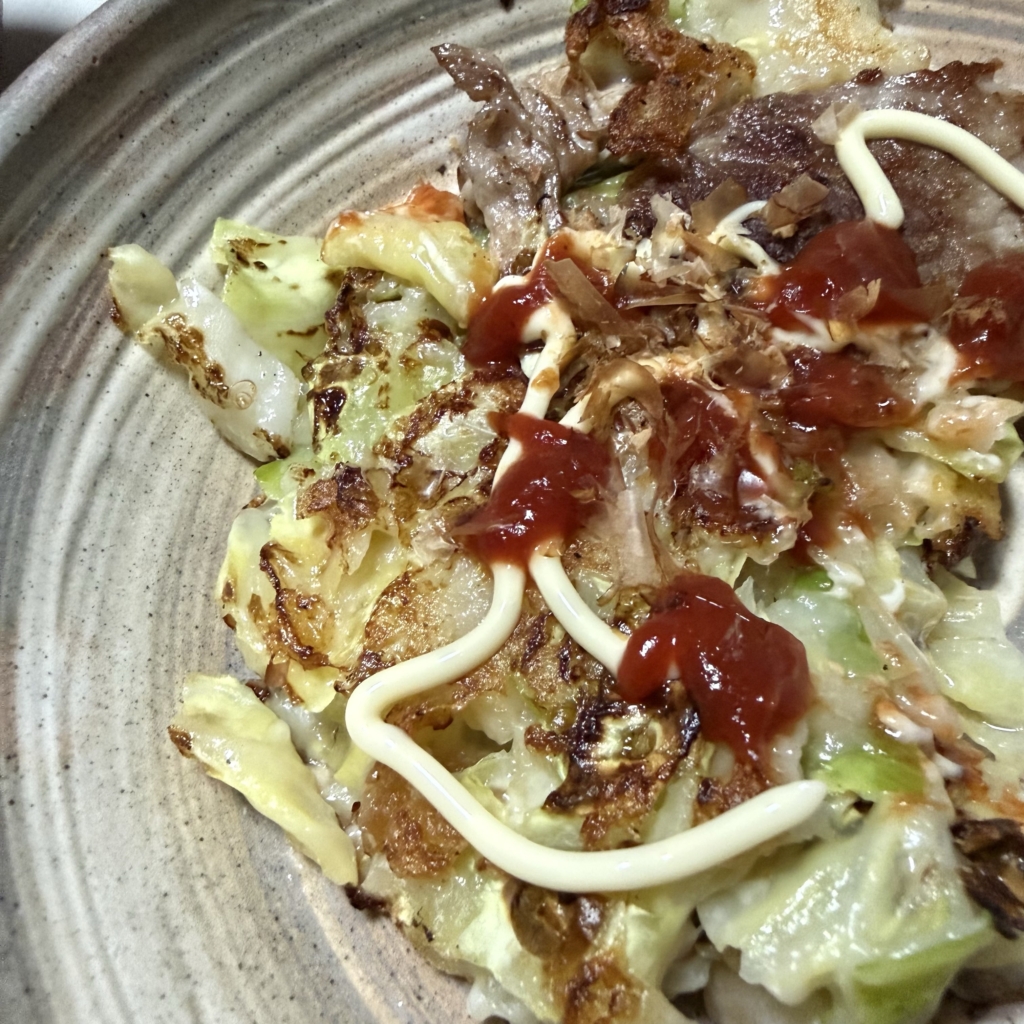 豚バラ肉のお好み焼き、少しチーズを入れてこんがり焼いたよ!美味しく出来ました。