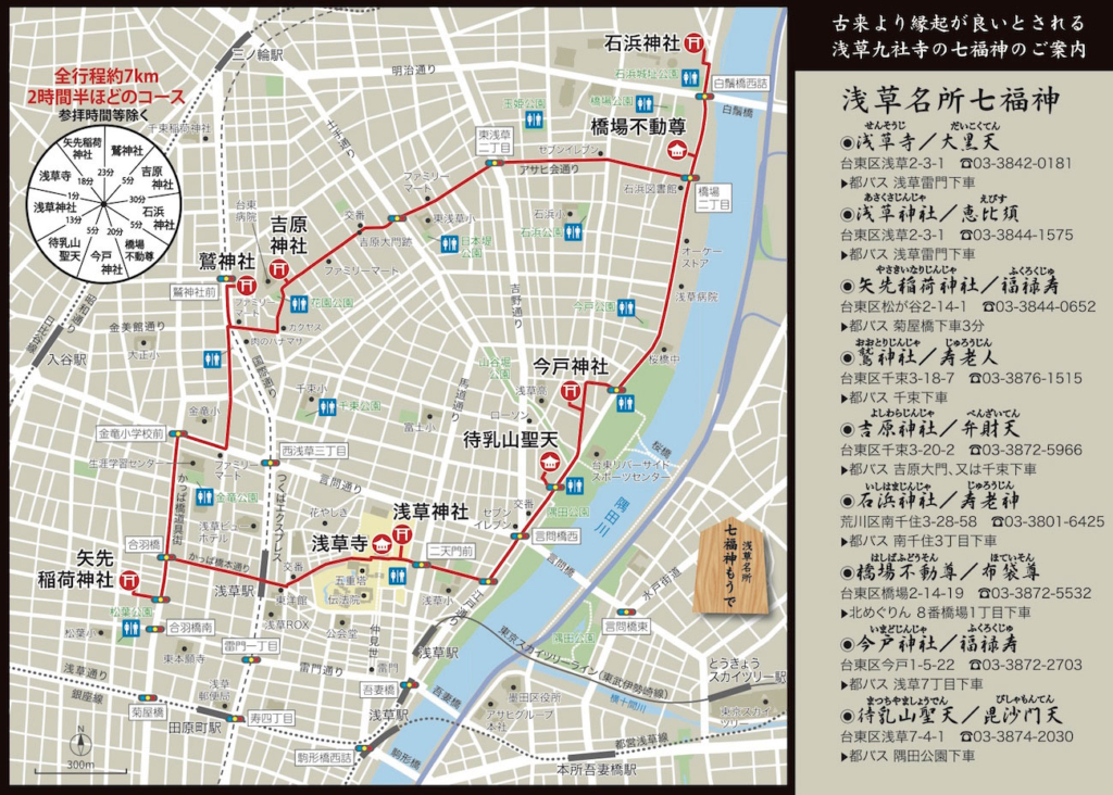 橋場不動尊(布袋尊)、石浜神社(寿老神)、吉原神社(弁財天)、鷺神社(寿老人)、