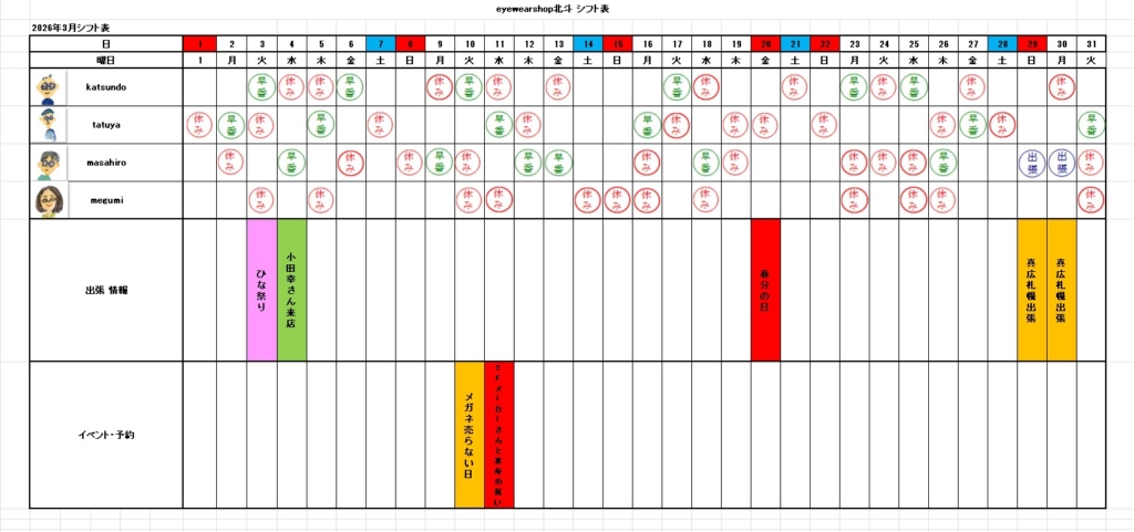 3月シフト表が出来ました 2026年02月27日 (Fri) PM1:21- ライフワーク シフト表 26日でオイラは喜寿を迎える!張り切って3月を楽しむよ~♪参考にしていただけると幸いです。(^^♪ では又~katsundo 今月は小樽に出没する予定です。(^^♪日帰りだからのんびりは出来ないけどね。以前小樽に行った時の写真。 この記事を書いた人 katsundo - 書いた記事一覧 前の記事 : 無事税金払い終わりました!ホッ~♪ コメント お気軽にコメントよろしくね コメントを投稿する コメントをキャンセルメールアドレスが公開されることはありません。 Name(必須です) Email(必須です) Web Site Comment Δ